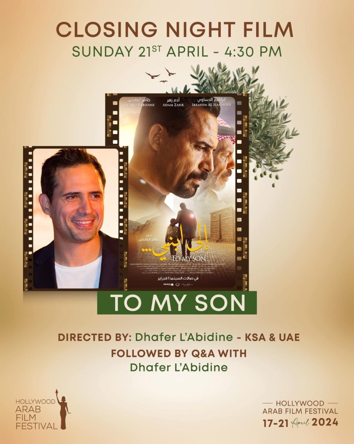فيما لفت إلى أنه يمكن للجمهور الالتقاء بالفنان التونسي عقب عرض فيلمه “إلى ابني” الذي يعرض خلال الليلة الختامية للدورة الثالثة، حيث سيتم عرض الفيلم يوم الأحد الموافق 21 أبريل في تمام الساعة الـ 4:30 عصراً.